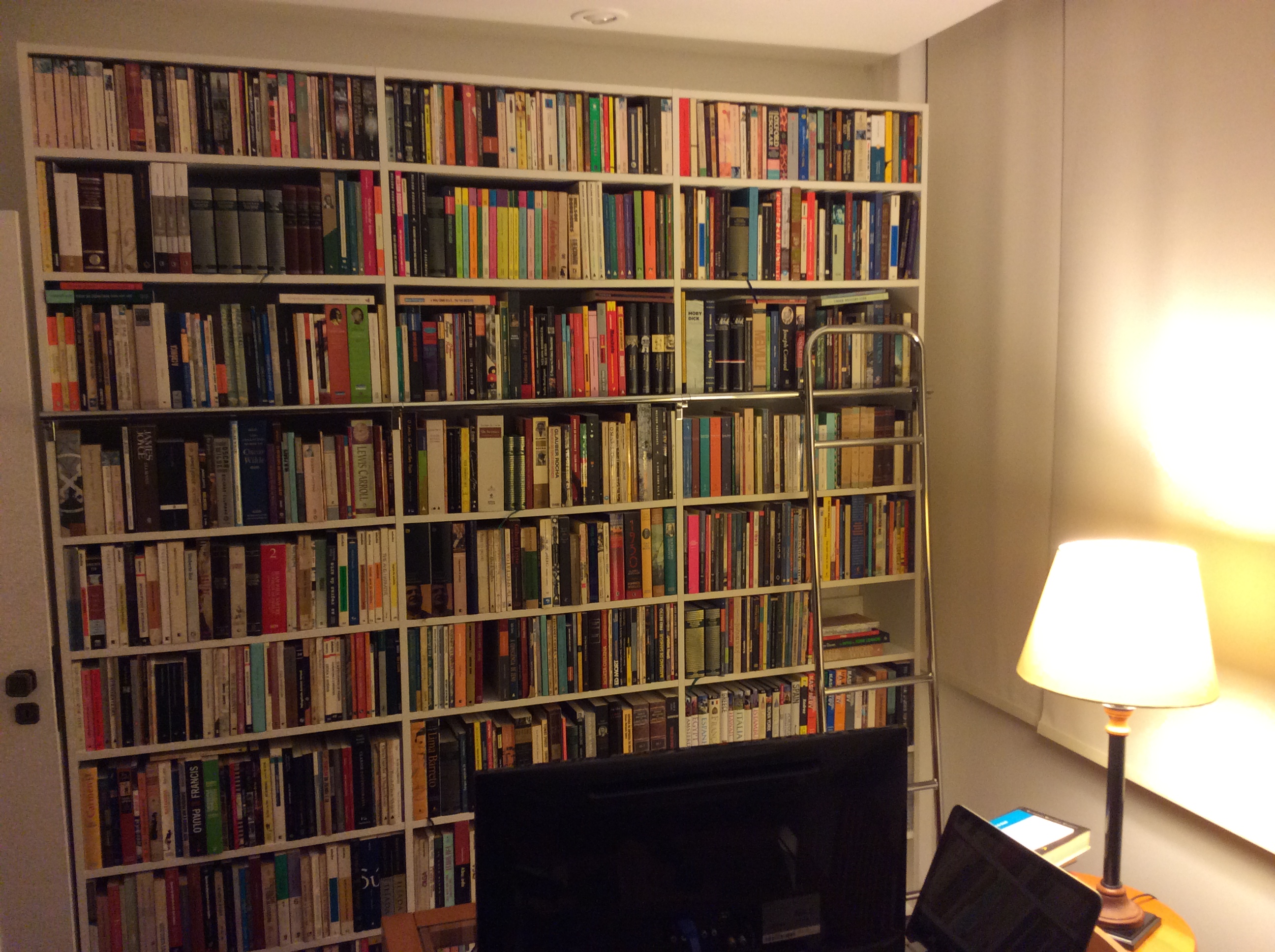 Se alguns livros adquiridos com a bolsa de bancada foram escrutinados em detalhe, outros nunca foram tocados. Vim a me dar conta disso agora. Sempre guardei meus livros espalhados em prateleiras pela casa de forma totalmente aleatória. Sabia onde encontrar os autores que procurava por pura intuição. Recentemente resolvi cuidar melhor deles e comprei uma estante maior para ordená-los e estabelecer alguma organização no caos. Meus livros não são muitos, mas pra mim são mais do que o suficiente. Tenho certeza que muitos vão ficar por aí sem nunca terem sido tocados. Ao pensar sobre como organizá-los, descartei logo a ideia de ordem alfabética, porque não tenho e nem pretendo ter livros em quantidade o bastante para isso. Não sou e nunca serei um leitor voraz (e com dinheiro no bolso) como o Umberto Eco que vive em meio ao gigantesco labirinto de estantes de sua casa em Milão.