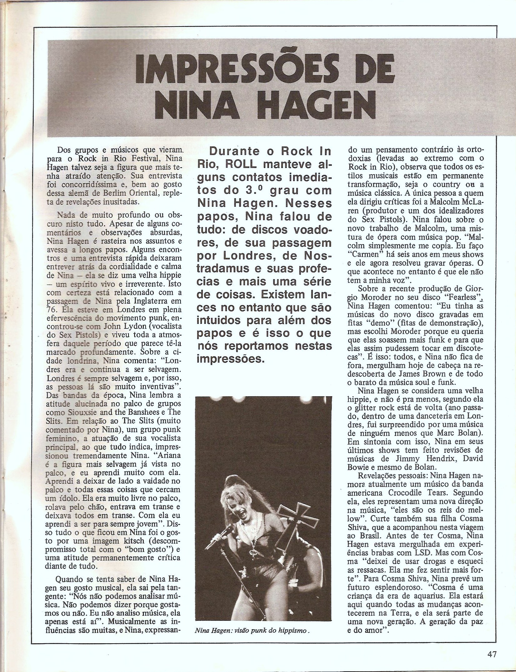Em uma única oportunidade nos encontramos. Foi em janeiro de 1985, durante o primeiro Rock in Rio. Entre as incontáveis entrevistas com Queen, Rod Stewart, Ian Anderson, houve uma com a cantora Nina Hagen. Em uma sala adjacente a um quarto do Hotel Cassino Atlântico (depois, Sofitel e hoje, Fairmount), QG do festival, foi reunida uma legião de repórteres para enfrentarem a presença espalhafatosa da cantora alemã. Um a um os jornalistas iam entrando no quarto em que Hagen se encontrava para que sacassem suas perguntas e aguardassem pelas imprevisíveis e esotéricas respostas da compositora/performer. Esperamos muito tempo. Umas três horas, imagino.