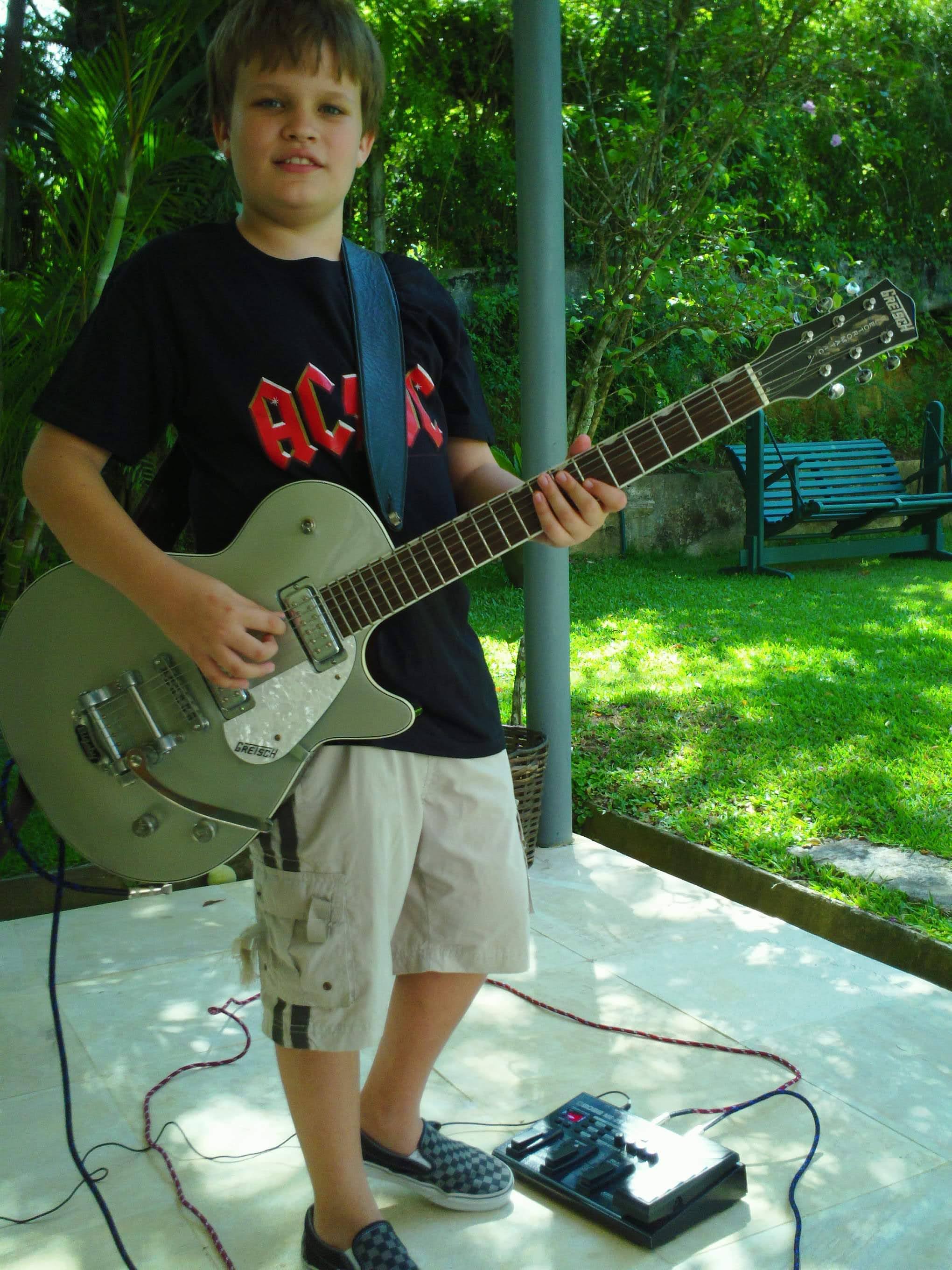 Com a Gretsch que escolheu de presente, na linha das guitarras favoritas de George Harrison