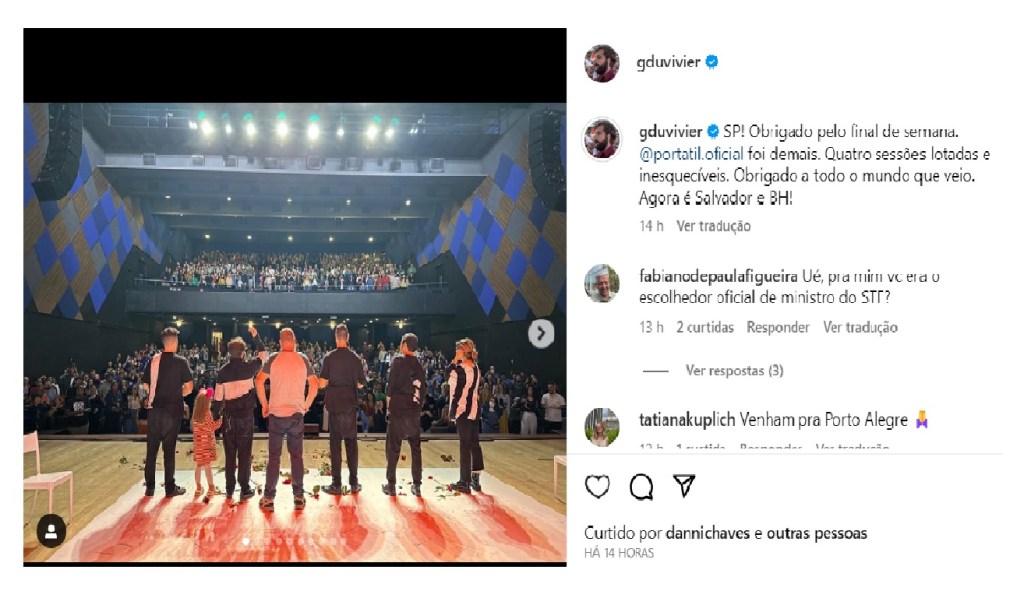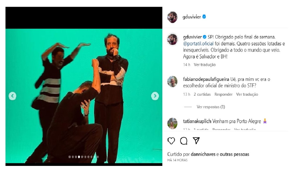 Teatrinho pra fechar o fim de semana: o “Portátil” do Porta dos Fundos. Confesso que prefiro o texto pronto como no Greg News ao improviso. Lembrou o filme de Eduardo Coutinho em que ele ouvia uma história e pedia para que ela fosse recontada. No caso do “Portátil”, uma história de vida de alguém do público é ouvida e recriada novamente pelos atores com escracho e humor pastelão. O públicou riu muito e saiu contente do espetáculo.