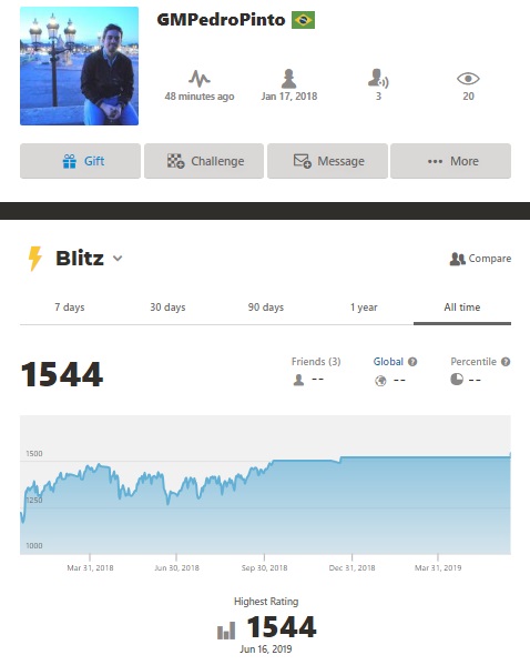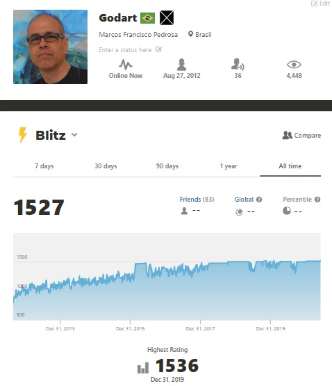 Eu me encontro entre os pingueiros do Chess.com e, como eles, tenho vários perfis. Em alguns, já ultrapassei a marca dos 1600. Mas nunca consegui chegar aos 1700, por exemplo. Atualmente sigo com um perfil em que apareço com 1400, lutando para ir um pouco adiante. Ainda que oscile entre os 1300 e 1600 e uns quebrados, nunca fiquei abaixo da marca dos 1300. É muito difícil crescer no xadrez sem se dedicar ao estudo sério e sem jogar constantemente. Por outro lado, depois que se chega a determinado patamar, ainda que se oscile bastante, é bem díficil que se caia significativamente.
