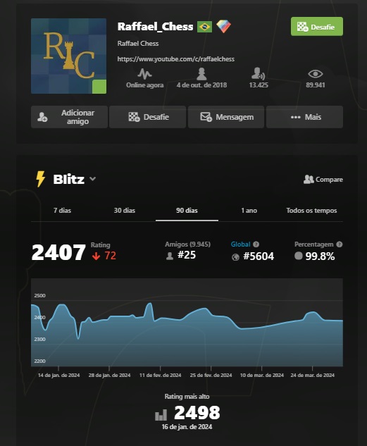 Com o Raffael Chess ocorre algo semelhante, o que comprova a acuidade dos parâmetros do Chess.com. Quando inaugurou o seu canal há 5 anos, ele buscava os 2300 de rating. Conseguiu romper a marca dos 2400 há um tempo, mas nunca a dos 2500. Ele segue tentando e vejamos se ele realiza essa proeza. Em fevereiro, ele chegou a 2486, o que sugere que ele vai, com alguma luta “que é o que o xadrez é e sempre será”, alcançar os 2500 – não confundir com as partidas dele de bullet (1 minuto de duração em que ele tem uma marca maior). Mas dificilmente veremos o Raffael Chess cair hoje dos 2300.