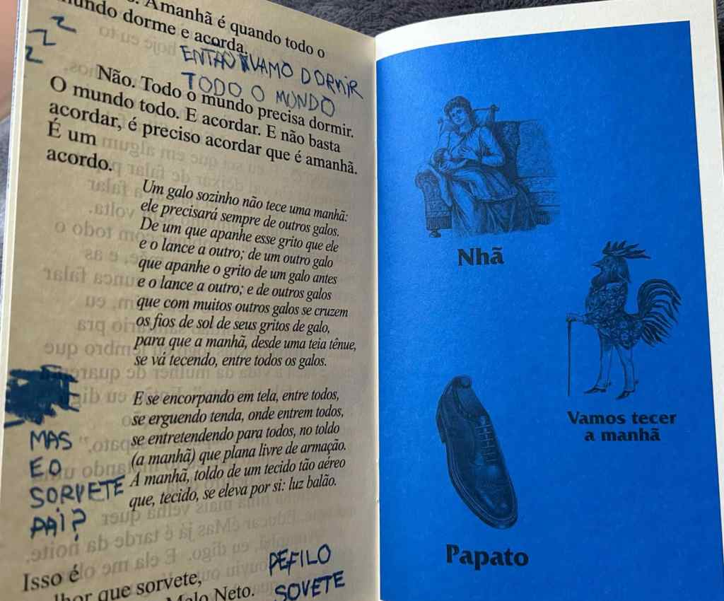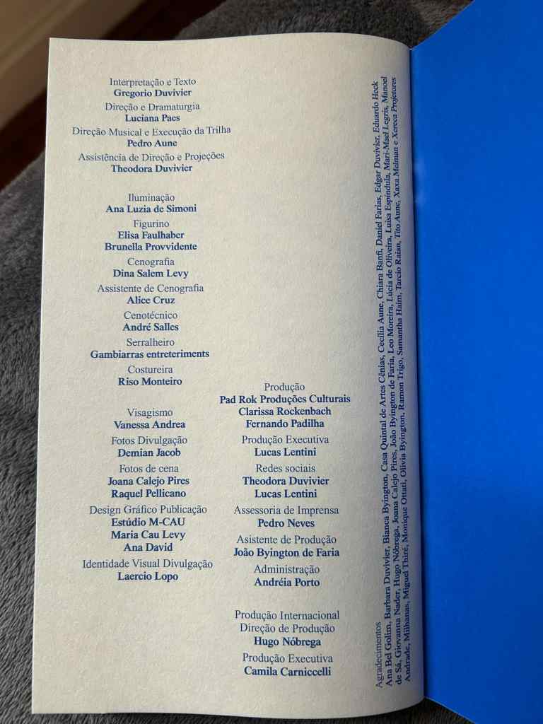 “O Céu da Língua” tem inventiva direção da preparadora vocal e corporal Luciana Paes, atriz com passagens por telenovelas da Globo (“Além do Horizonte”, “Fina Estampa”, “Quanto mais Vida, Melhor!”) e por séries do canal Multishow (“Adorável Psicose”, “Aí eu Vi Vantagem”, “Férias em Família”, “No Corre”), do GNT (“Três Teresas”, “Desnude”) e pelo cinema (“Crô, o Filme”, “Uma Quase Dupla”, “Férias Trocadas”). Atriz de longa carreira no teatro (fez “Gota d´Água”, “Calabar”, “Ópera do Malandro”, entre outras quase vinte peças teatrais) é colega de Gregório no Porta dos Fundos e em “Portátil”, que segue em cartaz. Uma das irmãs do dedicado propagandista do site Natureza Sana, Theodora Duvivier, faz assistência de direção e opera um velho retroprojetor trajando como o irmão o belo figurino de Elisa Faulhaber e Brunella Providente, figurino que casa à perfeição com a cenografia de Dina Salem Levy. Eles estão em cena junto com o músico Pedro Aune, que, ao contrário do que diz o texto gaiato da peça, não é búlgaro, mas brasileiro, formado, mestre e doutor em música pela Uni-Rio. À saída, o espectador ainda pode levar para casa o belíssimo libreto impresso no espírito da geração mimeógrafo com o texto integral que acabou de ver no palco em design assinado por Maria Cau Levy junto com sua parceira no Estúdio M-Cau Ana David.