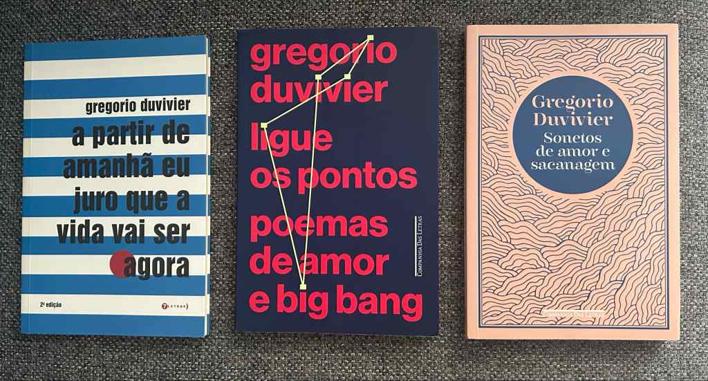 Gostei tanto que assisti por mais de uma vez ao espetáculo, só não bati o recorde do próprio Gregório que viu por sete vezes a peça “Os Ignorantes”, de Pedro Cardoso. Acompanho o multitalentoso humorista, que conversa de forma séria com os amigos e parceiros dos tempos do GregNews, Alessandra Orofino e Bruno Torturra, no podcast “Calma Urgente”, do Estúdio Fluxo no YouTube, desde que, bem jovem, se mostrou talentoso em lançar versos no mundo. Ele estreou com o livro de poemas “A Partir de Amanhã eu Juro que a Vida Vai Ser Agora” (Cia das Letras, 2008) e foi logo reconhecido por Millôr Fernandes que não se furtou a registrar: “O jovem – 22 anos ainda é jovem? – apresenta poesias que vão desde o quase haikai a sonetos. Soneto, sim senhor, uma bela forma de poesia que nunca voltou. Porque nunca desapareceu. Gregório é um poeta concreto. Não confundir com concretista.” Millôr foi secundado por outro grande poeta. Ferreira Gullar comentou sobre o mesmo livro do debutante: “Gregório evita o dó de peito e brinca inteligentemente com a emoção.” Na sequência do livro de poesias de estreia, viriam ainda uma segunda seleta poética em “Ligue os Pontos, Poemas de Amor e Big Bang” (Cia das letras, 2013) e o mais recente “Sonetos de Amor e Sacanagem” (Cia das Letras, 2021).