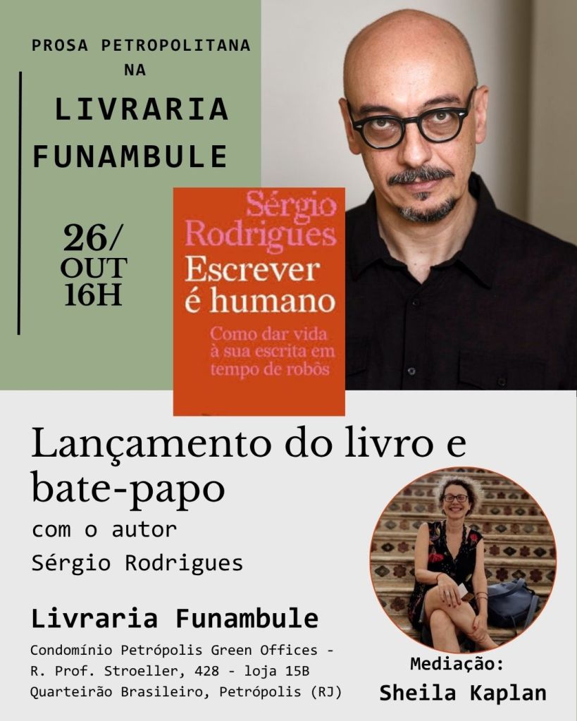 Olá, turma petropolitana, neste domingo o escritor Sérgio Rodrigues vai conversar sobre sua trajetória e suas obras (festejadas com prêmios como o Portugal Telecom/Oceanos, SP de Literatura, além de finalistas de várias edições do Jabuti) no espaço aconchegante da Livraria Funambule no Quarteirão Brasileiro em Petrópolis. É o lançamento de seu novo livro “Escrever é Humano”, em que dá dicas e discute o uso de IA por escritores. Sérgio Rodrigues conversa com a resenhista do Jornal Valor e escritora Sheila Kaplan. O autor também estará autografando seus livros. Apareçam